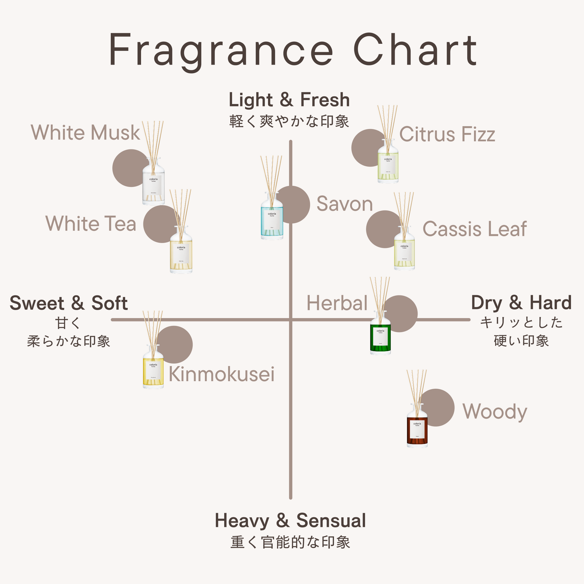 咲き始めの金木犀がふわりと風に乗るようなやさしくも鮮やかな香りに、そっとムスクが重なります。懐かしさと静けさに包まれた空間をお楽しみいただけます。