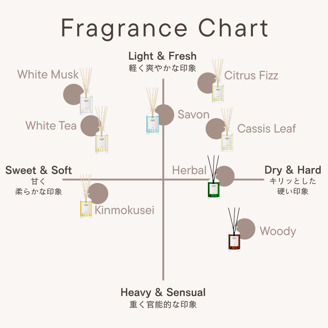 本体のキャップを外し、付属のスティックをボトルに挿してご使用下さい。本数を変えて微調整できます。使い始めはスティックを挿してから2~3時間後にスティックの上下を入れ替えると香りが広がりやすくなります。香りが弱くなってきた時にも同様にスティックの上下を入れ替えるのがおすすめです。